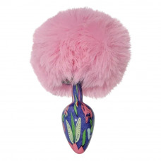 Анальная пробка небольшого размера с металлической вставной частью конической формы и заостренным кончиком. Корпус имеет глянцевую синюю поверхность с декоративным узором. Конструкция сужается к вершине для постепенного введения. Основа выполнена в виде объемного розового пуха с легким блеском. Пух густой, розовый, закреплен на металлическом стержне по центру. Общий вид сочетает гладкий металлический элемент и мягкую декоративную основу.